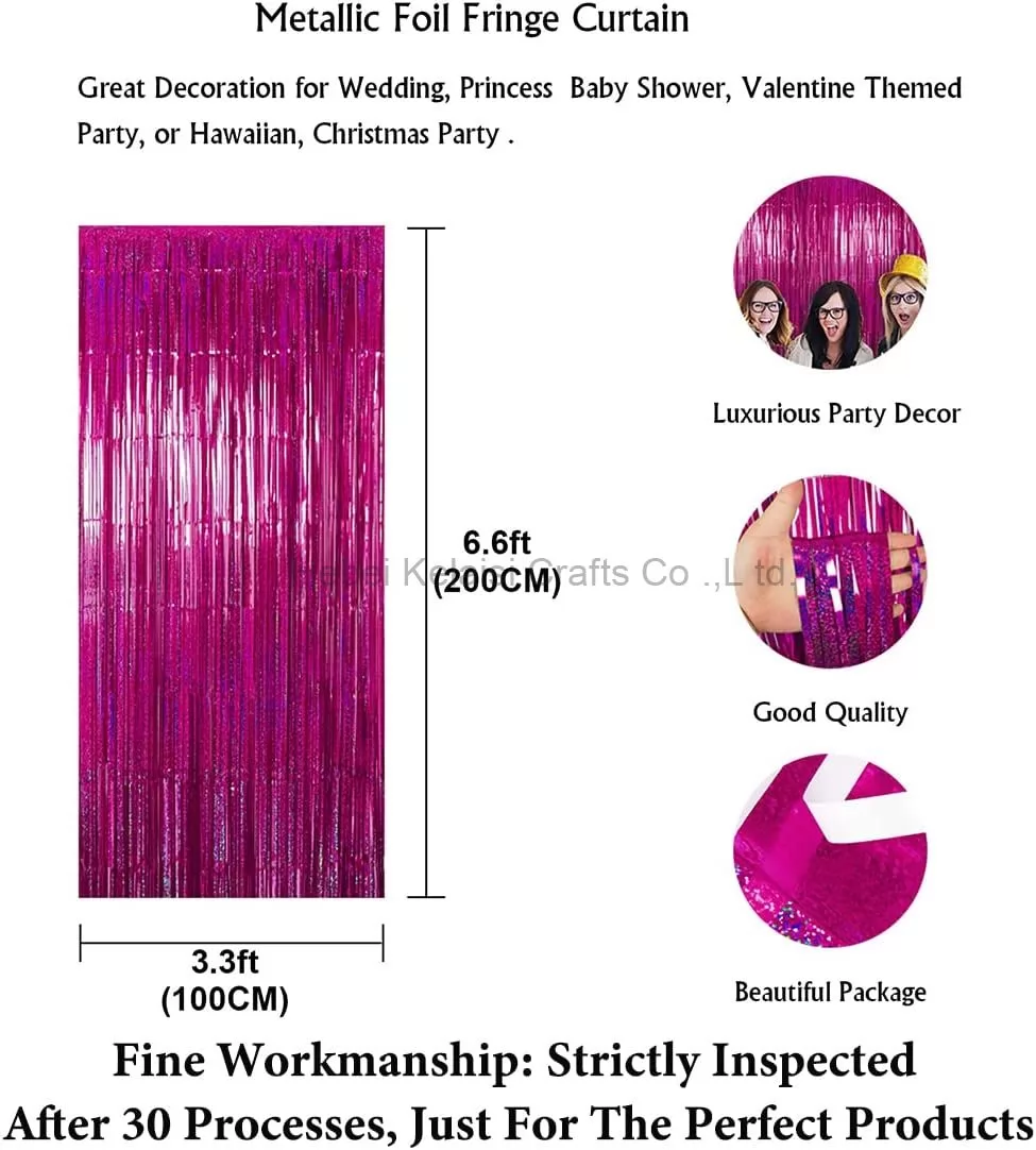 2Packs 3.3FT Wide and 6.6FT Tall hot pink laser tinsel foil fringe backdrop curtain. Beautiful and sparkle metallic laser foil curtains need 2 or more to coverage a wall fully.